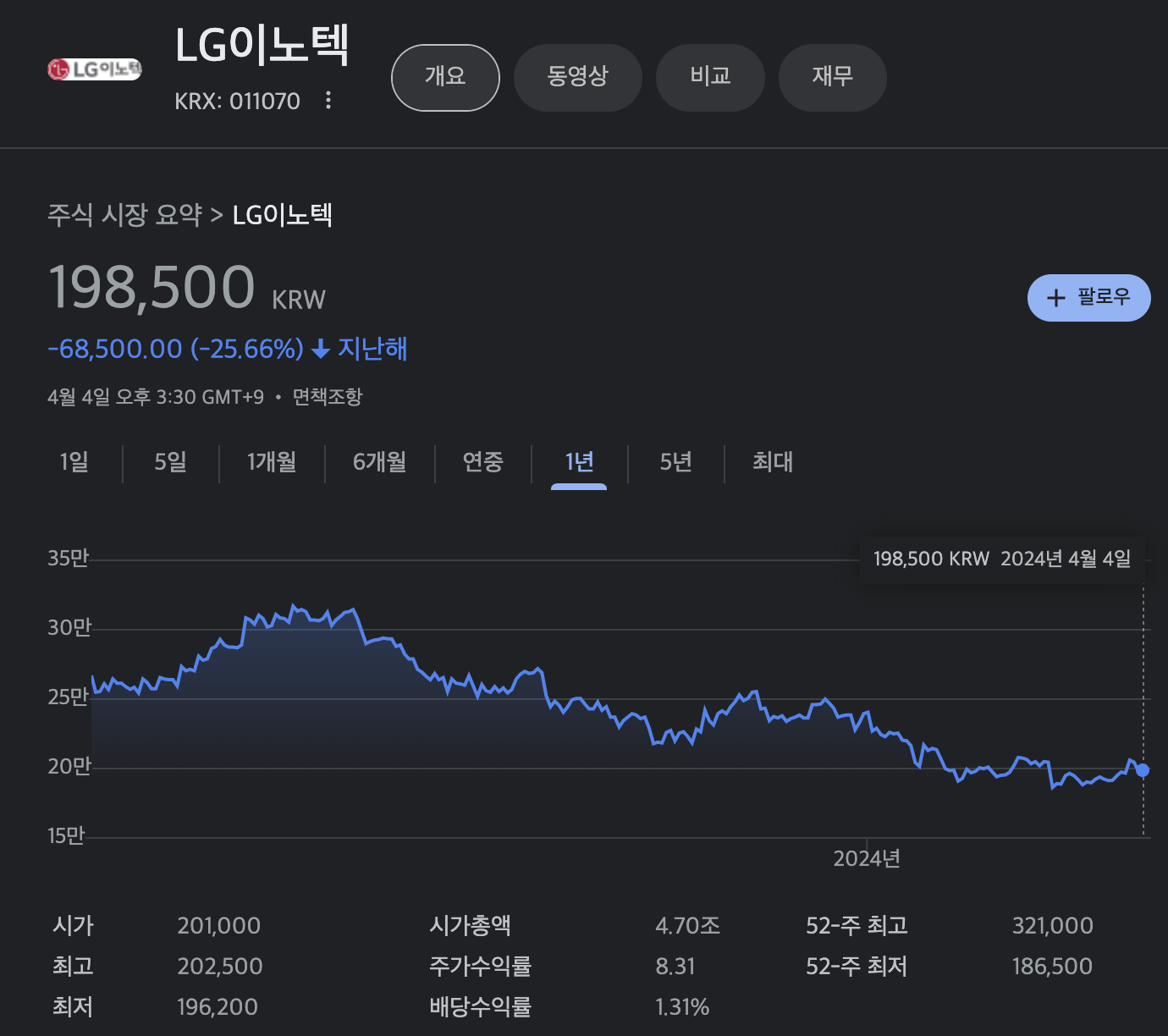 LG이노텍 주가는 지난해 대비 -25.66% 하락해 있습니다.
