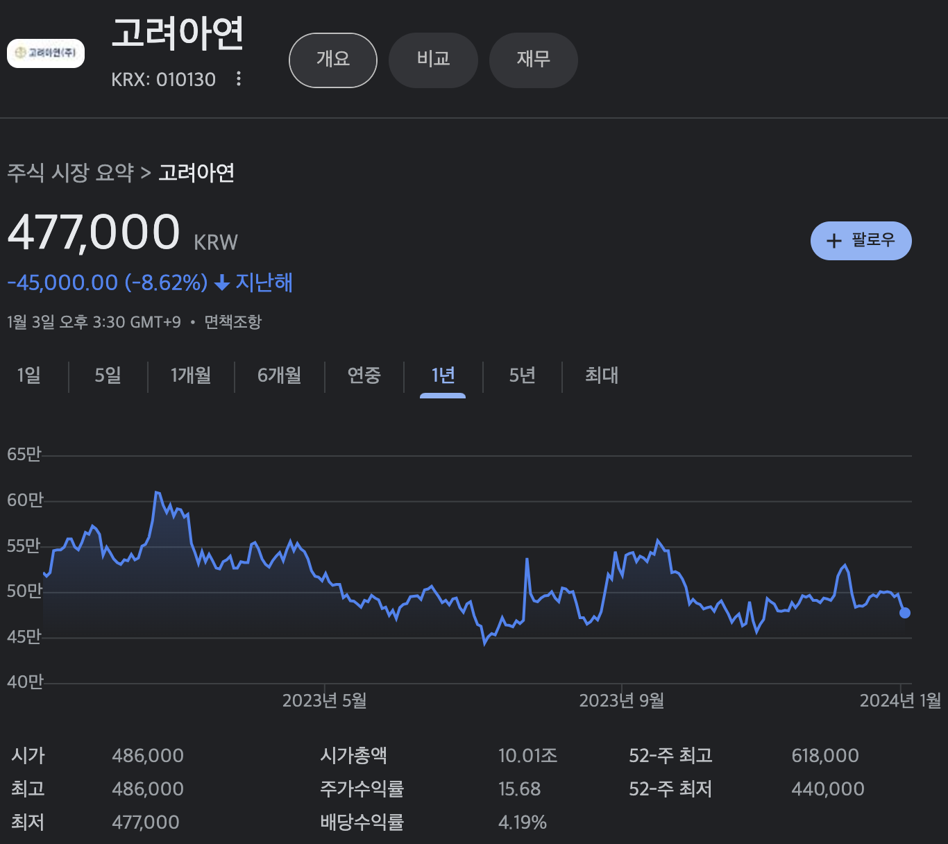 고려아연의 주가는 지난해 1년대비 -8.62% 하락해 있습니다.