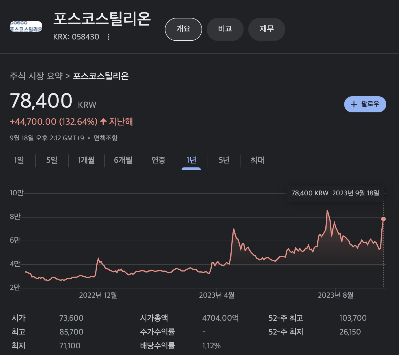 포스코스틸리온의 주가는 지난해 1년대비 132.64% 상승해 있는 상태입니다. (2023년 9월 기준)