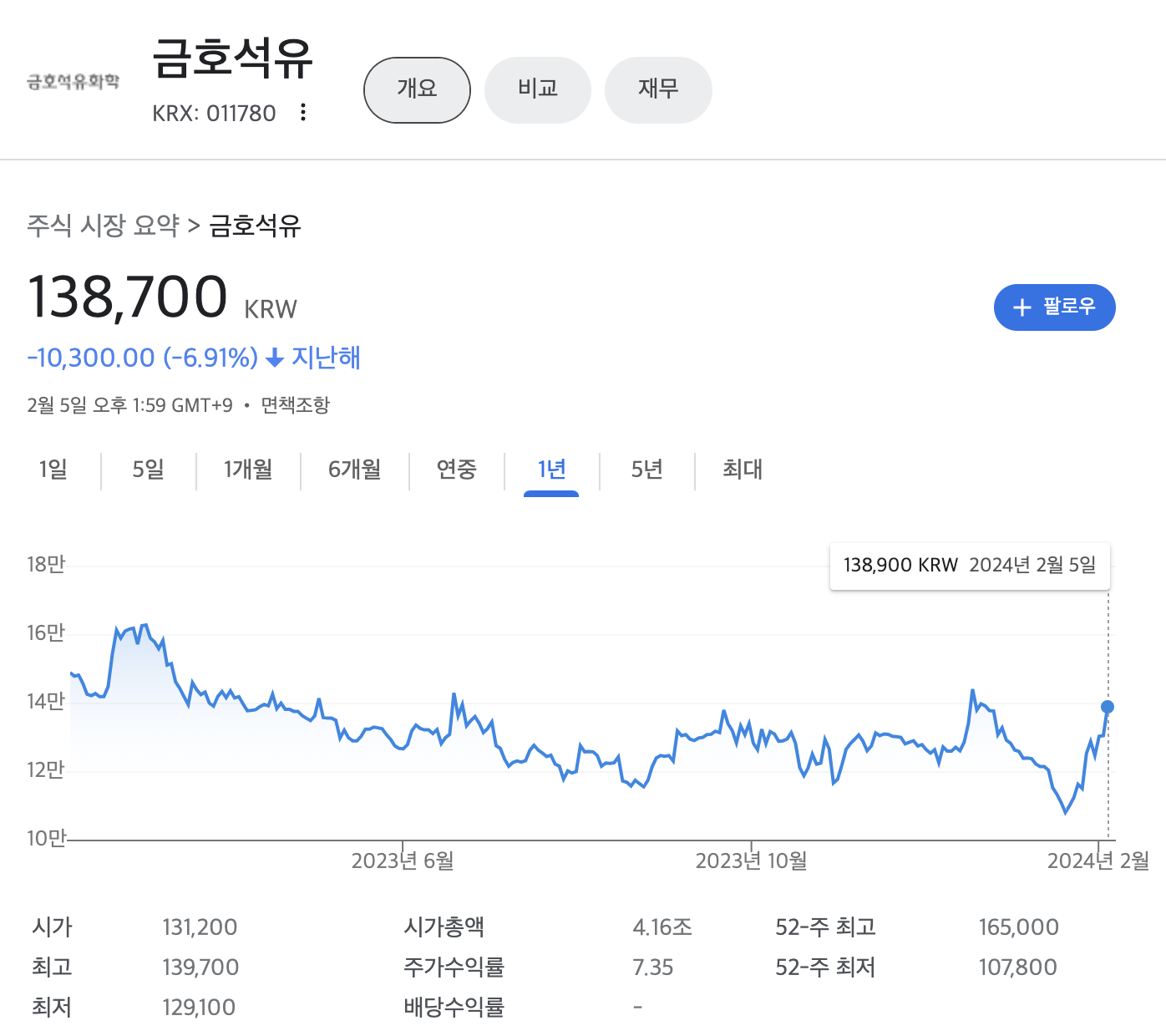 금호석유(011780) 주가 및 뉴스 - Google Finance