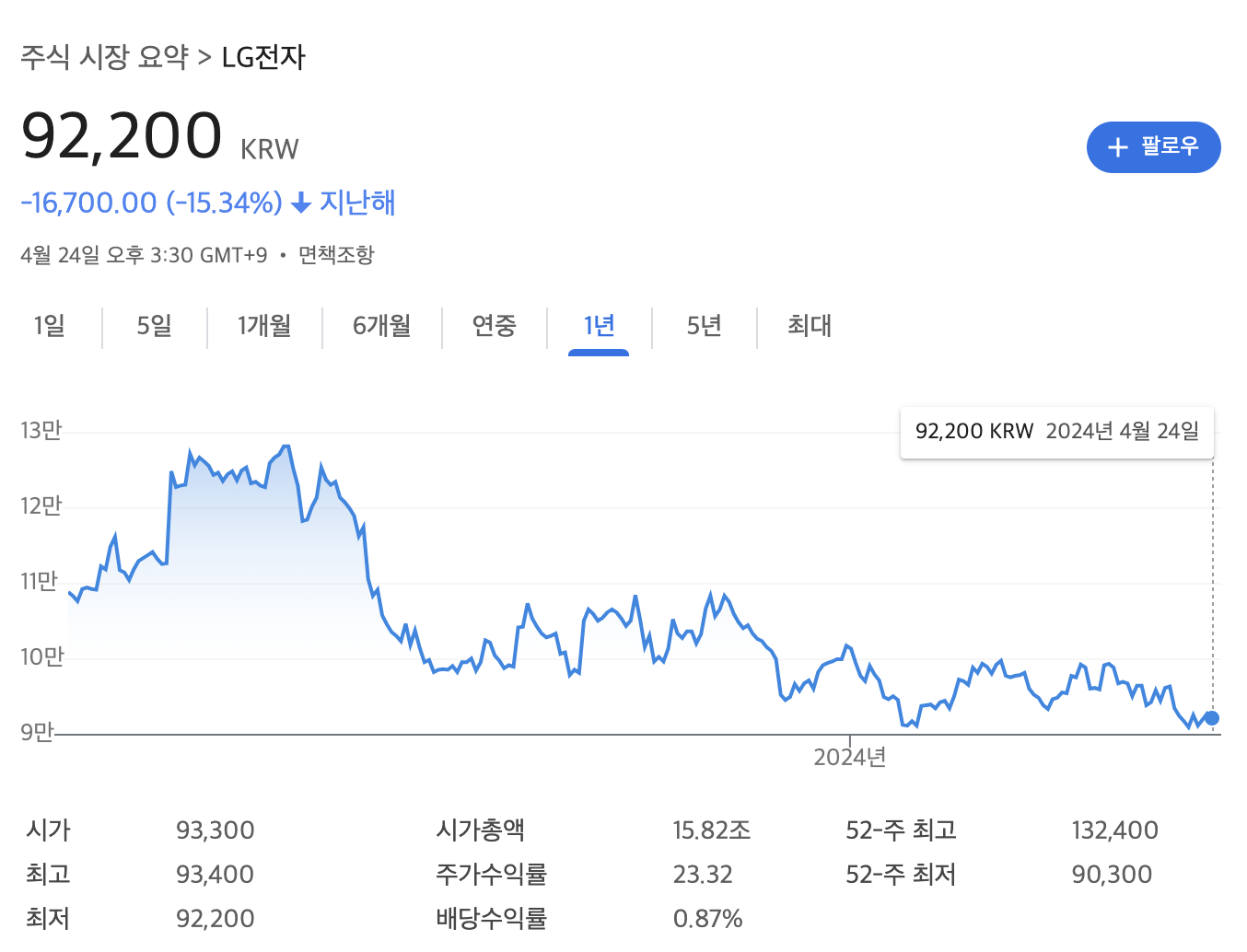 LG전자의 주가는 지난해 1년대비 -15.34% 하락해 있는 상태입니다.
