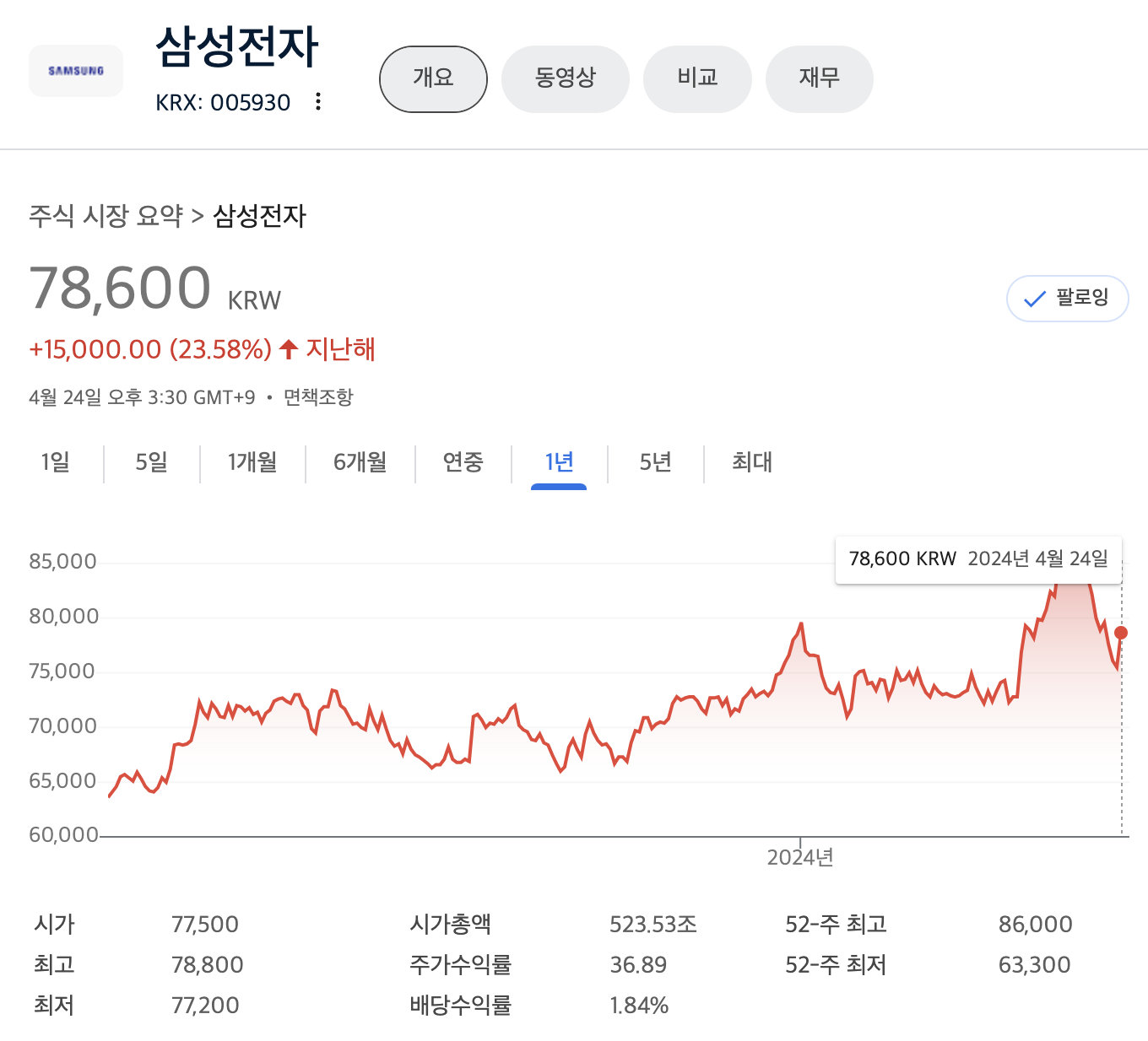 삼성전자의 주가는 지난해 1년대비 23.58% 상승해 있는 상태 입니다.