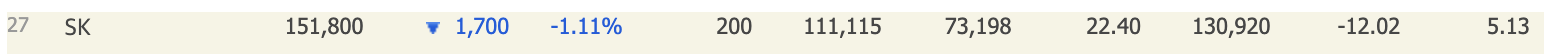 SK는 코스피에 상장되어 있으며 시가총액 27위의 기업입니다. (2023년 10월기준)