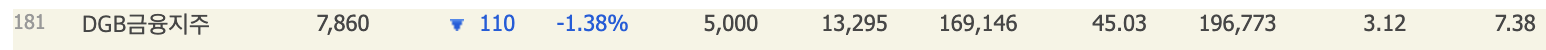 DGB금융지주는 코스피에 상장되어 있으며 시가총액 181위의 기업입니다. (2023년 10월기준)