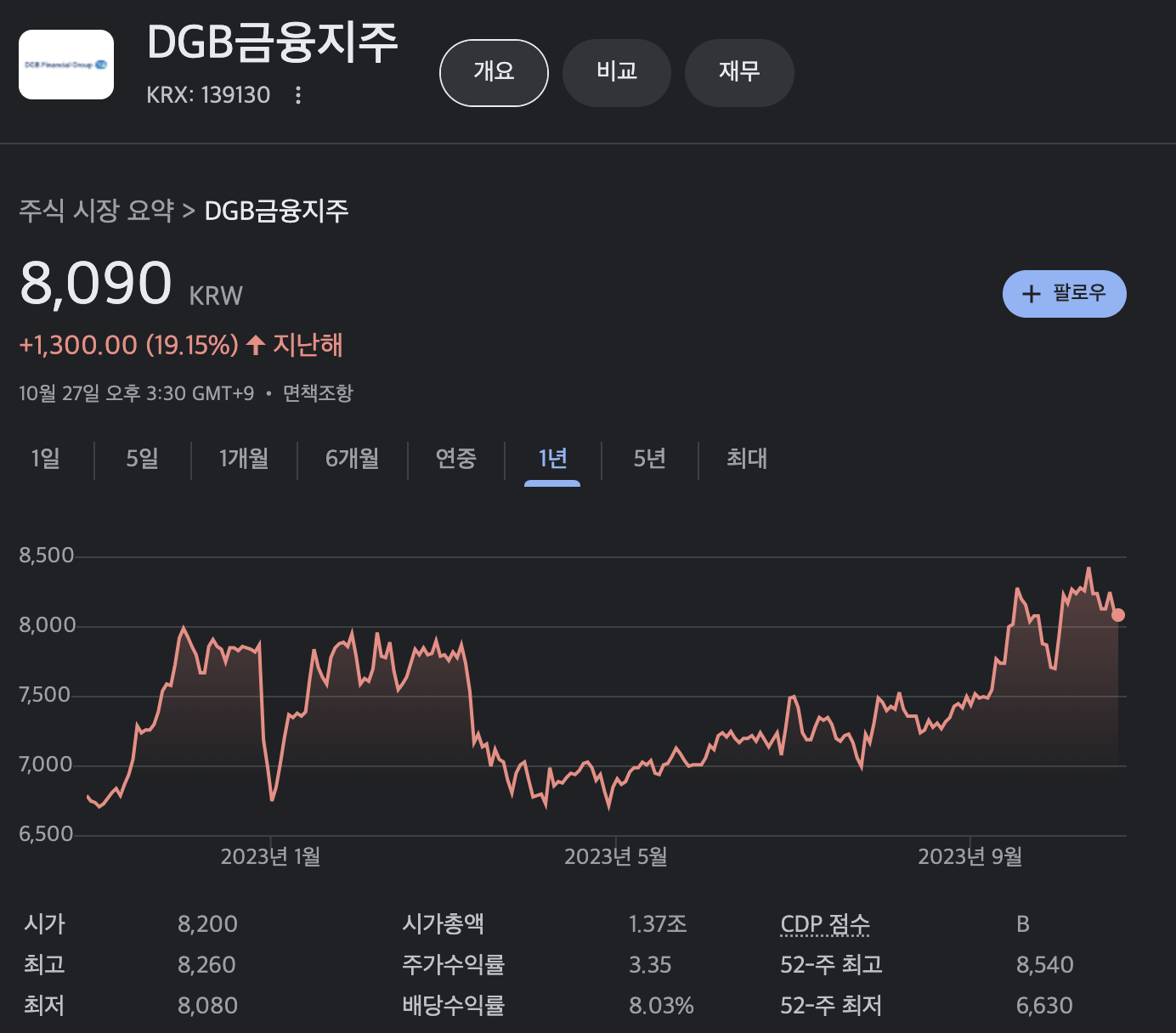 DGB금융지주 주가는 지난해 1년대비 19.15% 상승해 있는 상태입니다.