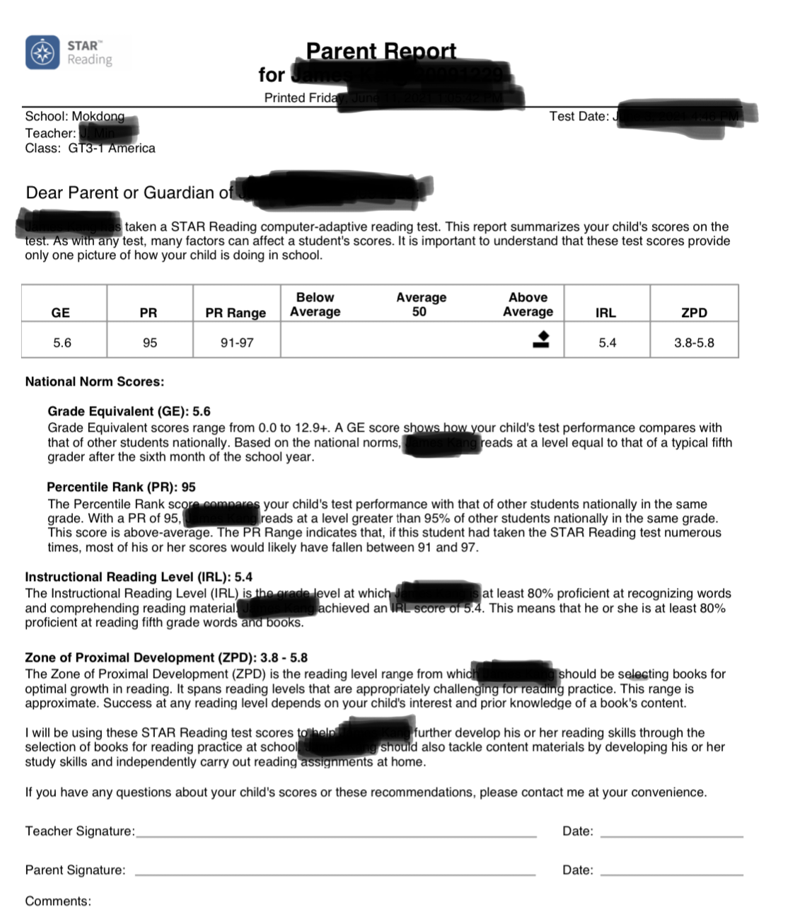 아래의 이미지가 sr 테스트를 보고나면 받는 Parent Report입니다.