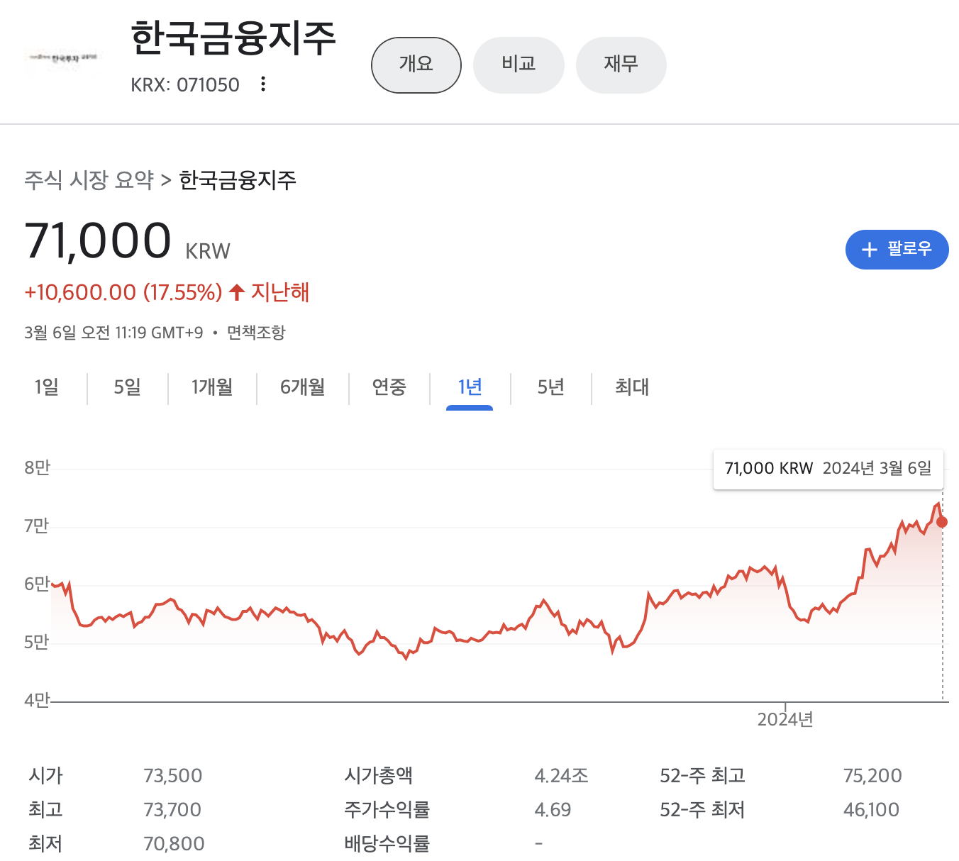 한국금융지주는 코스피에 상장되어 있으며 시가총액 93위의 기업입니다.(2024년 3월기준)