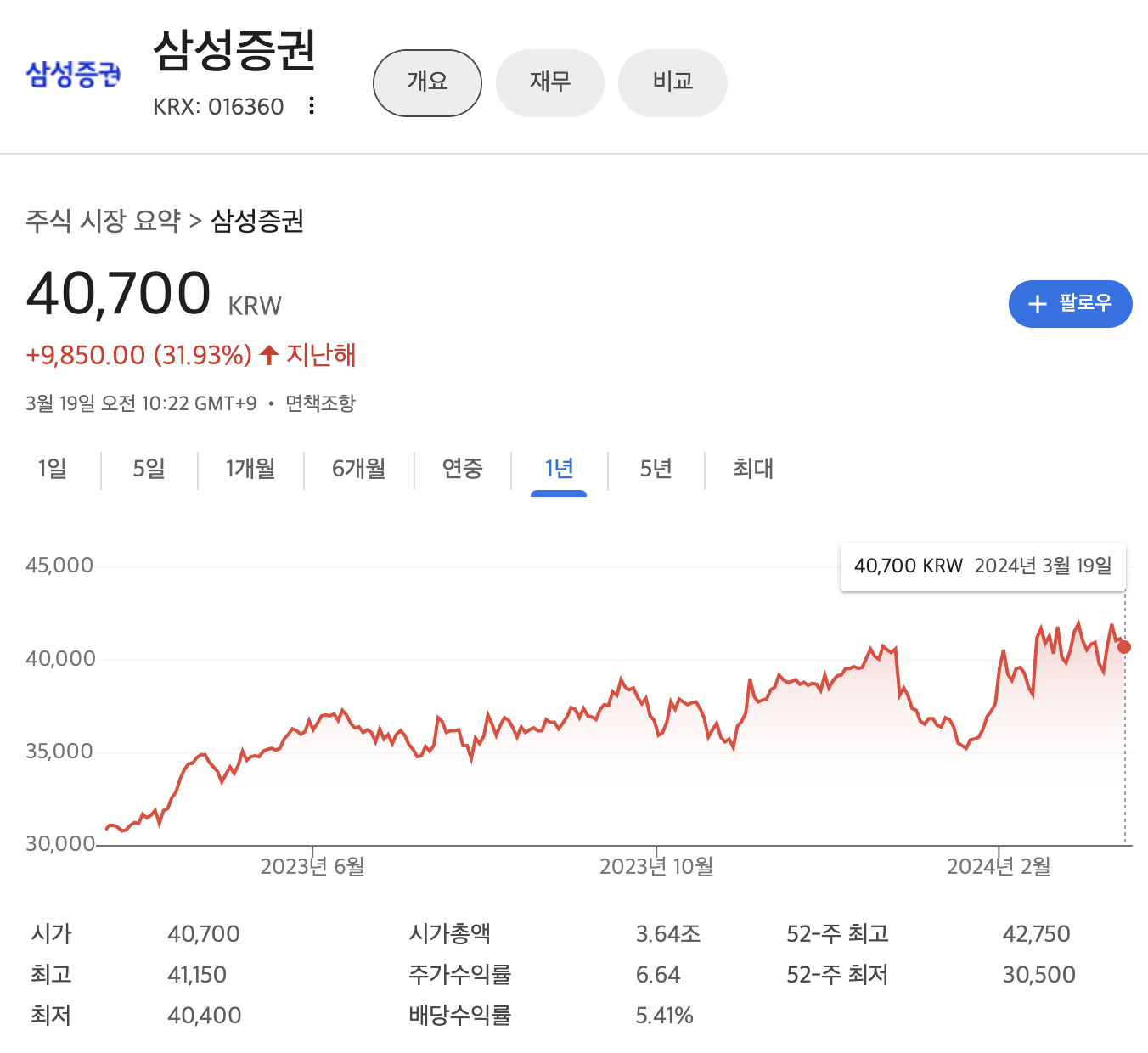 삼성증권의 주가는 지난해 1년대비 31.93% 상승해 있습니다.