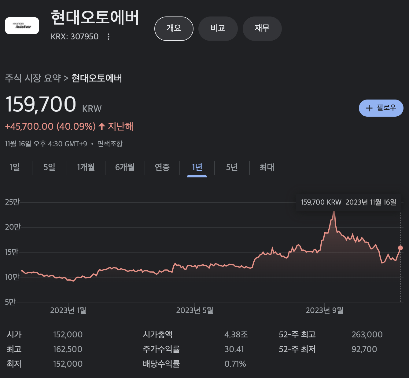 현대오토에버 주가는 지난해 1년대비 40.09% 상승해 있는 상태입니다.