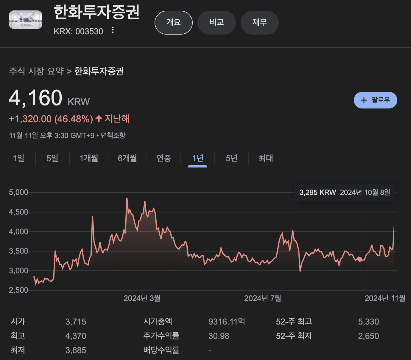 한화투자증권의 주가는 지난해 1년대비 46.48% 상승해 있는 상태입니다.