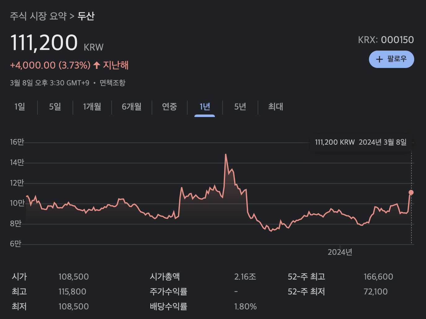 두산 기업의 주가는 지난해 1년 대비 3.73% 상승해 있는 상태 입니다.