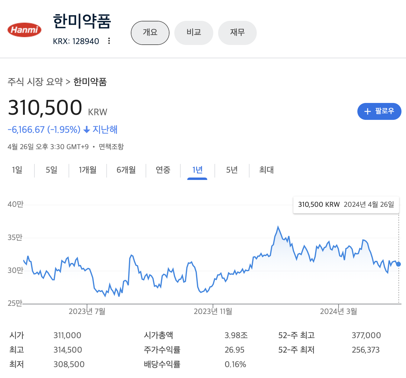 한미약품의 주가는 지난해 1년대비 -1.95% 하락해 있는 상태 입니다.