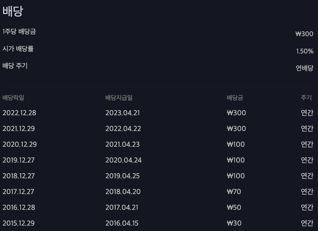 2015년부터의 연간 배당금액을 알고 싶으시면 아래의 이미지를 참고 하시면 됩니다.