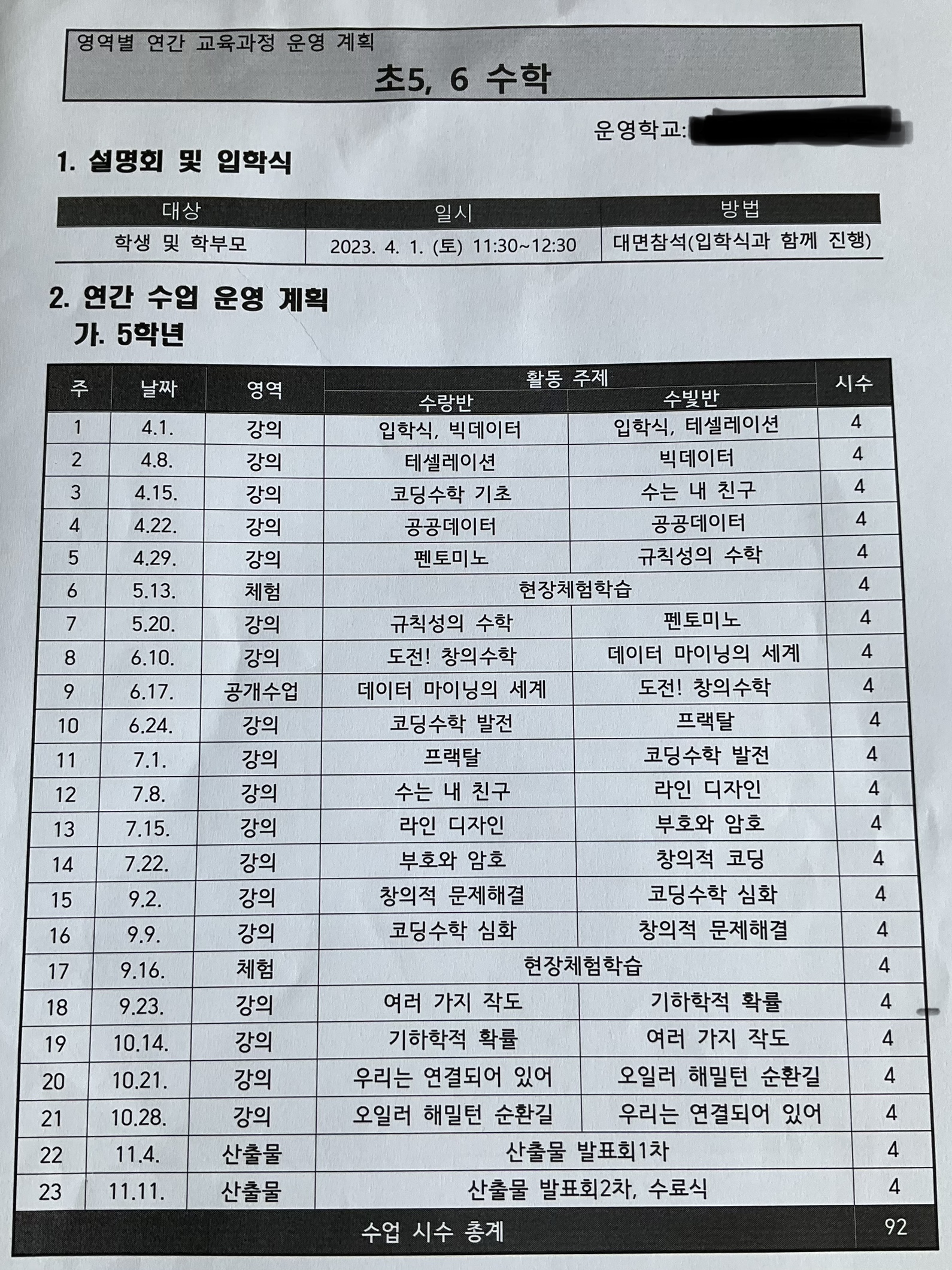 2023년 3월에 1호가 받아온 교육청 영재원 수학 교육과정 계획입니다.