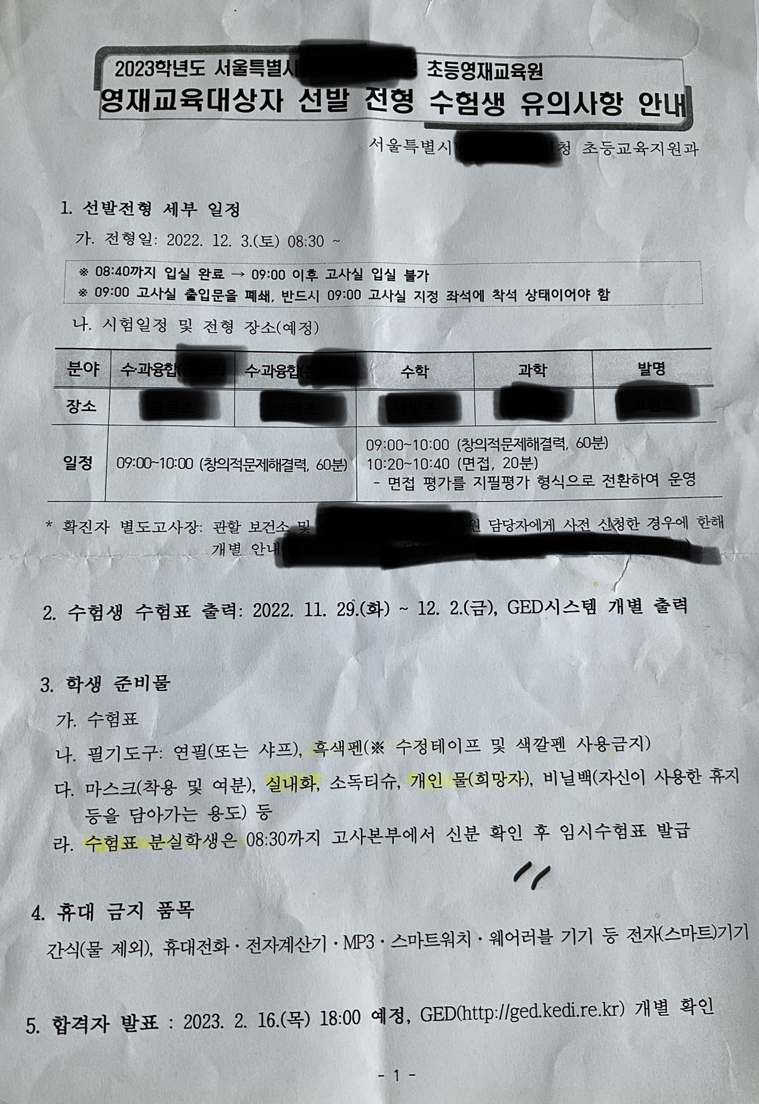 대학교 영재원은 1차로 서류(자기소개서)와 지필고사, 2차로 교수님의 면접이 존재합니다.