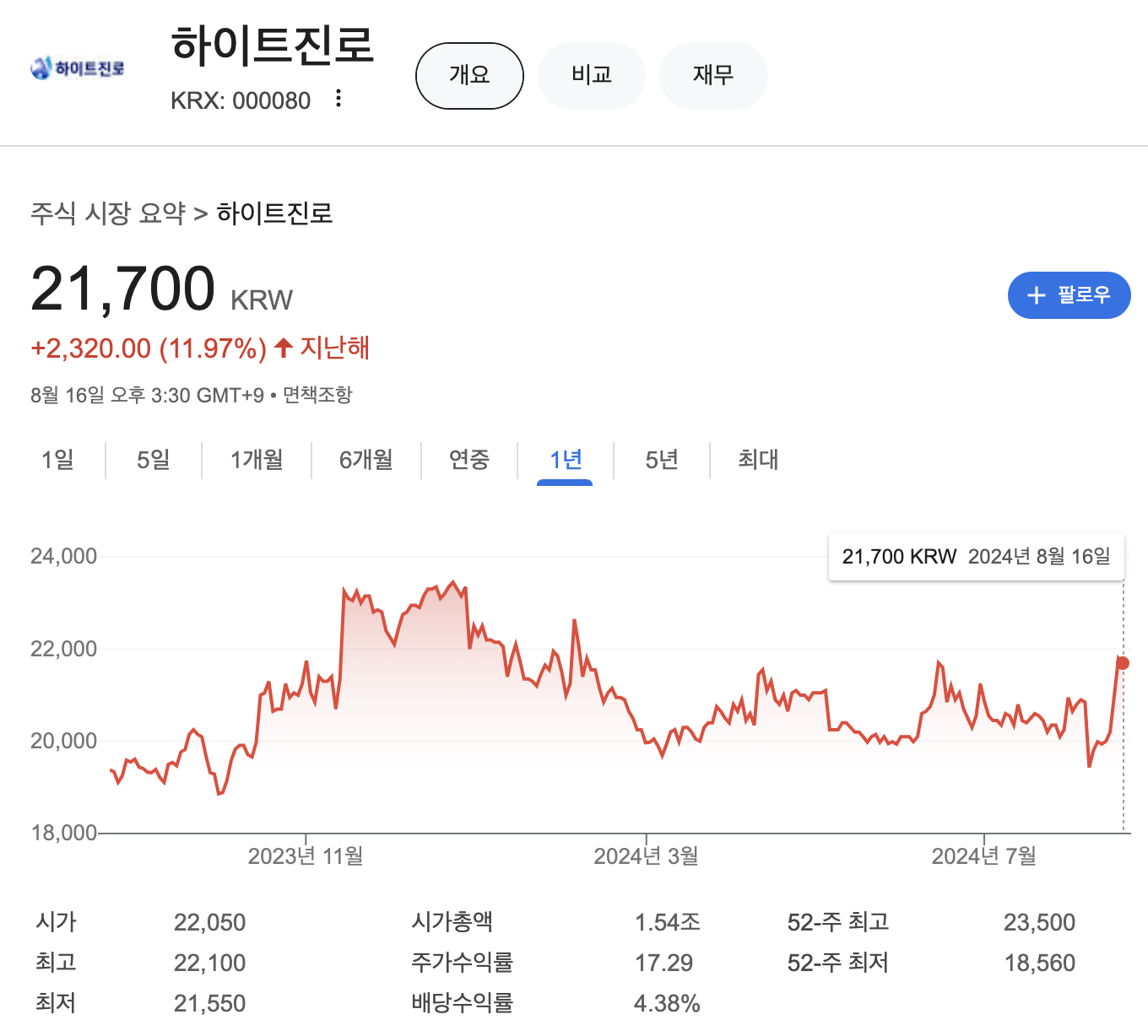 52주 최고 23,750원 이었으며 52주 최저 18,560원 이었습니다.