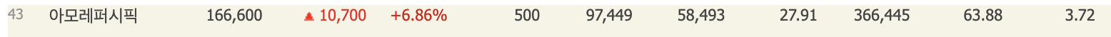 아모레퍼시픽은 코스피에 상장되어 있으며 시가총액 43위의 기업입니다.(2024년 4월기준)