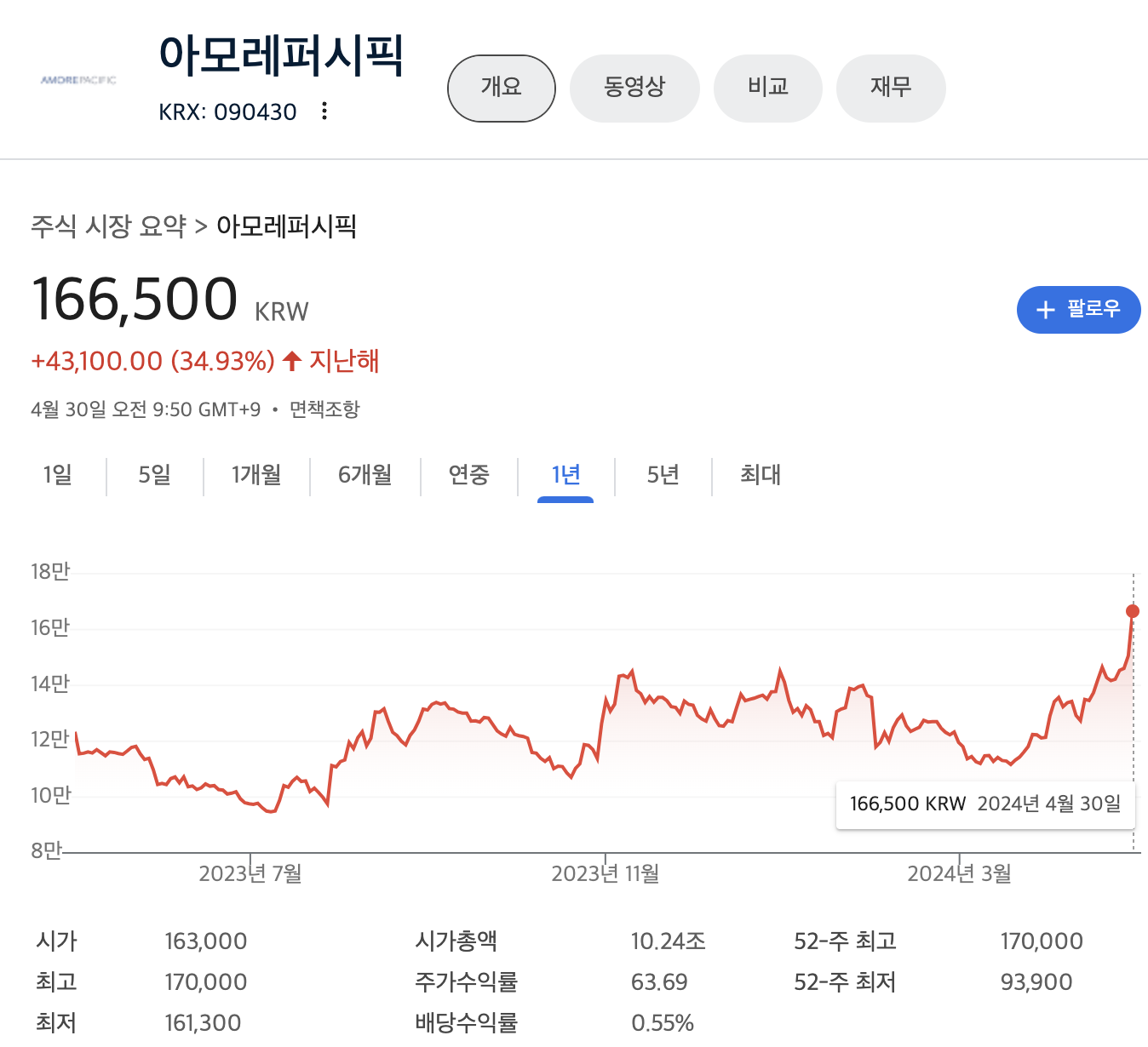 아모레퍼시픽의 주가는 지난해 1년대비 34.93% 상승해 있는 상태 입니다.