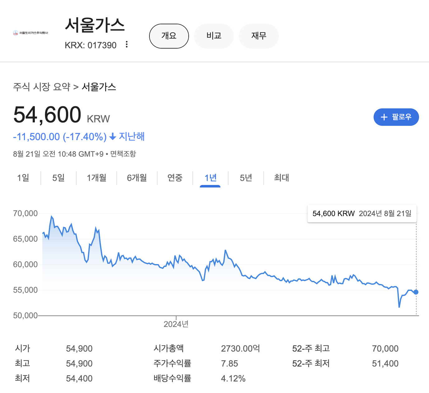 서울가스의 주가는 지난해 1년대비 -17.40% 하락해 있는 상태 입니다.