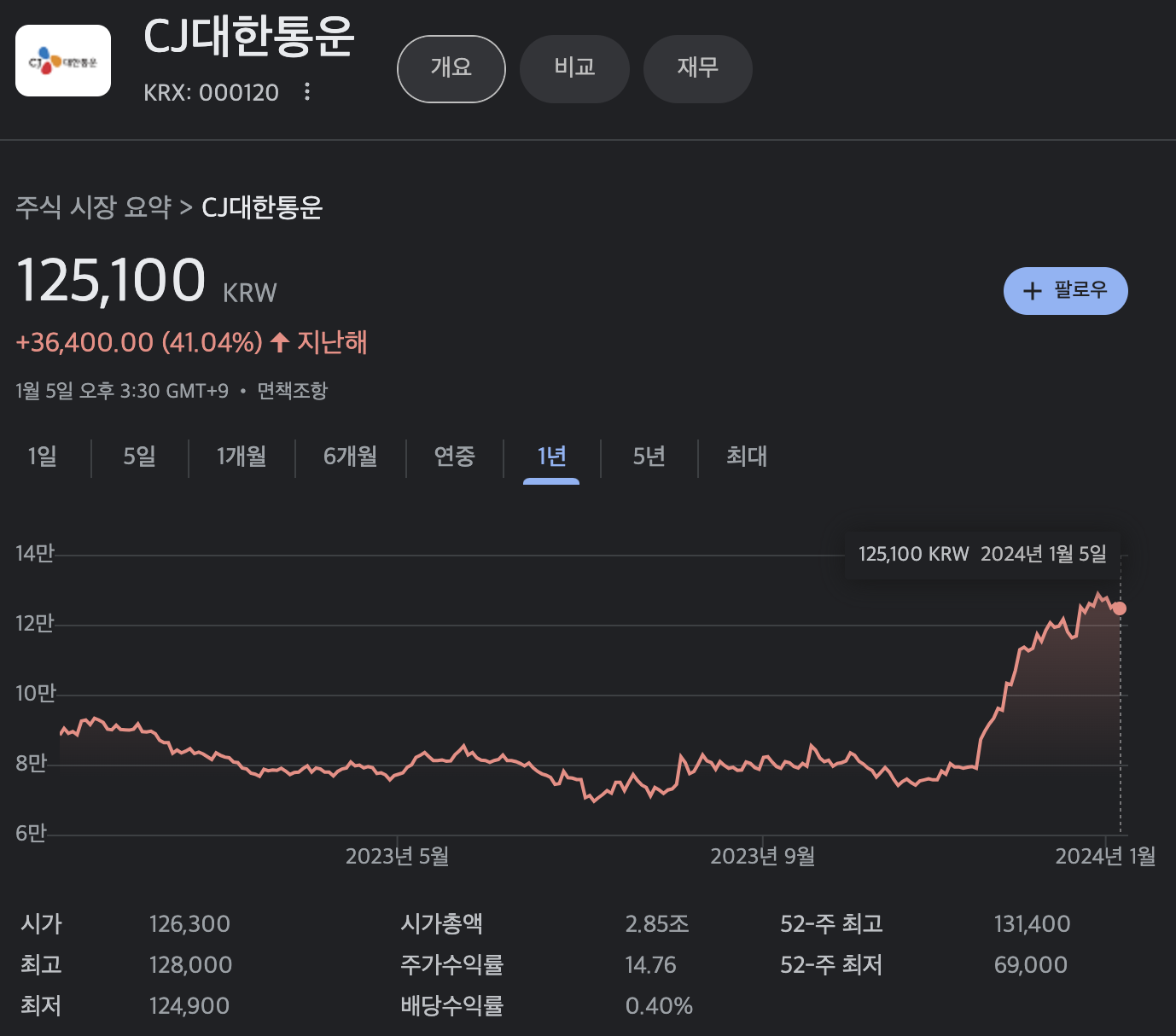 CJ대한통운의 주가는 지난해 1년대비 41.04% 상승해 있는 상태 입니다.