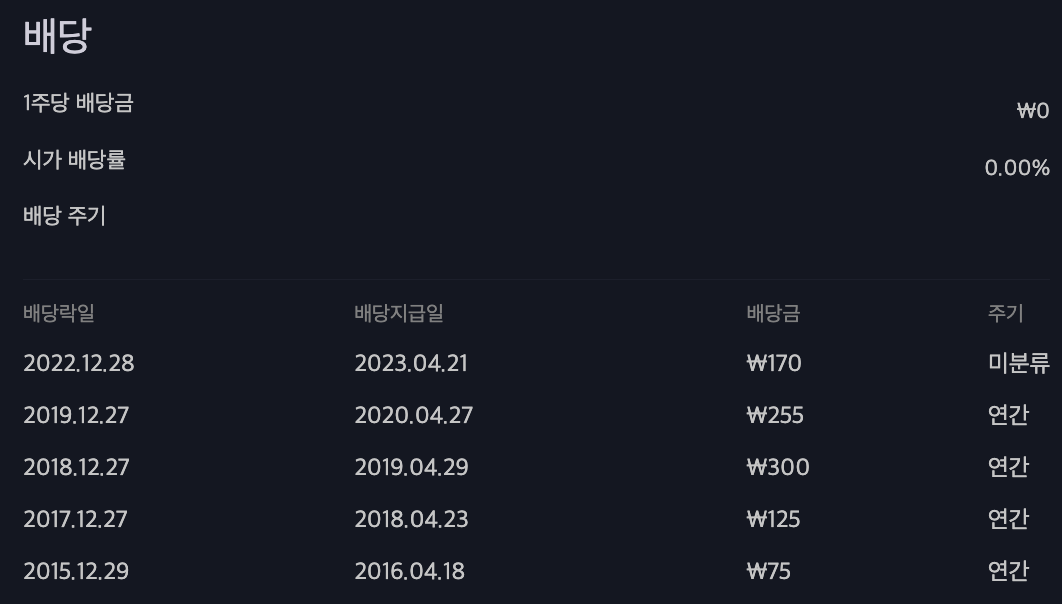2017년, 2021년, 2022년은 배당을 실시 하지 않았습니다.