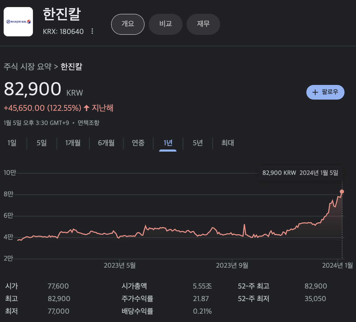 한진칼의 주가는 지난해 1년대비 122.55% 상승해 있는 상태 입니다.
