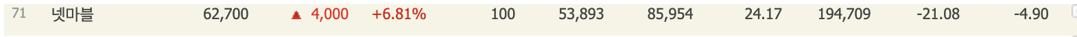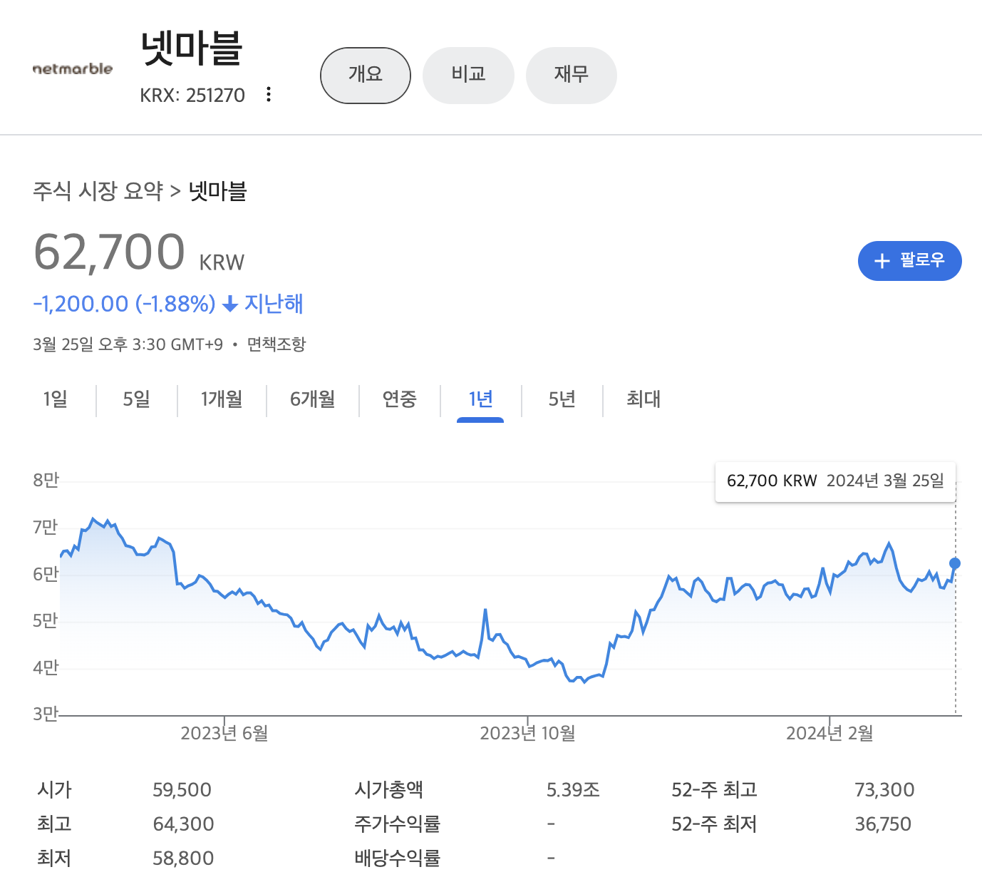 넷마블은 코스피에 상장되어 있으며 시가총액 71위의 기업 입니다.(2024년 3월기준)