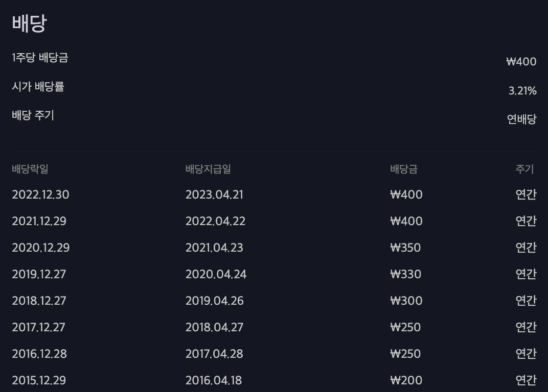 2016년부터의 배당금은 하단의 이미지를 참고 하시면 됩니다.