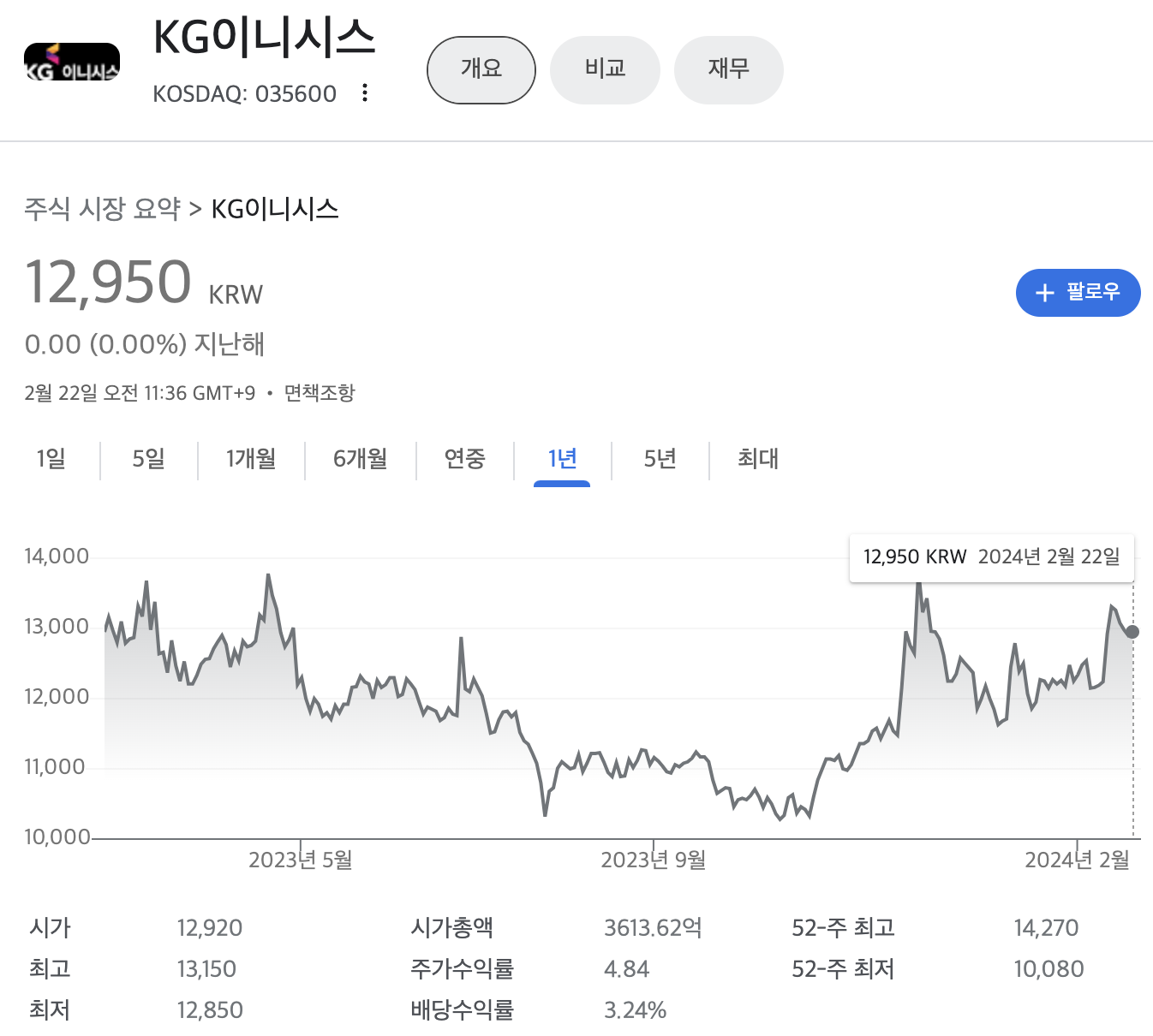KG이니시스 주가(2024년 2월기준)