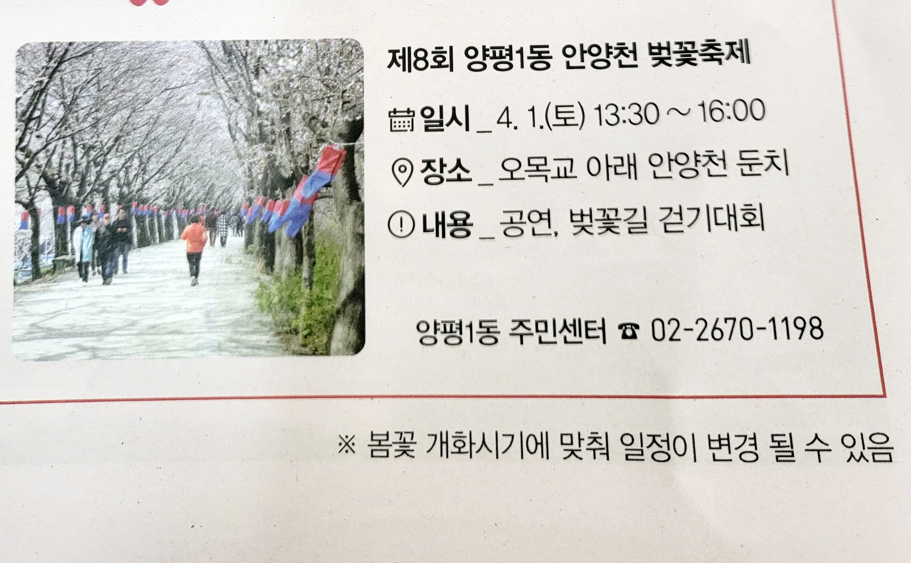 2023년 안양천 벚꽃축제가 이번주 토요일에 있습니다. 처음 가는 축제라 어떤 행사가 진행될지 궁금합니다.