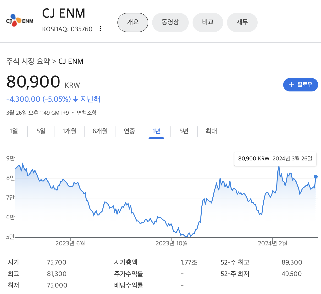 CJ ENM의 주가는 지난해 1년대비 -5.05% 하락해 있는 상태 입니다.