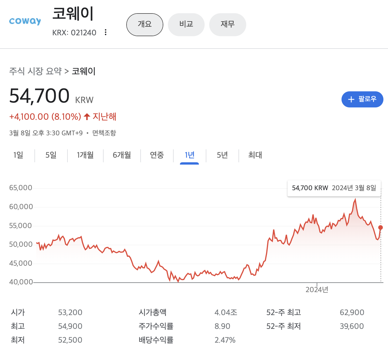 코웨이의 주가는 지난해 1년대비 8.10% 상승해 있는 상태 입니다.