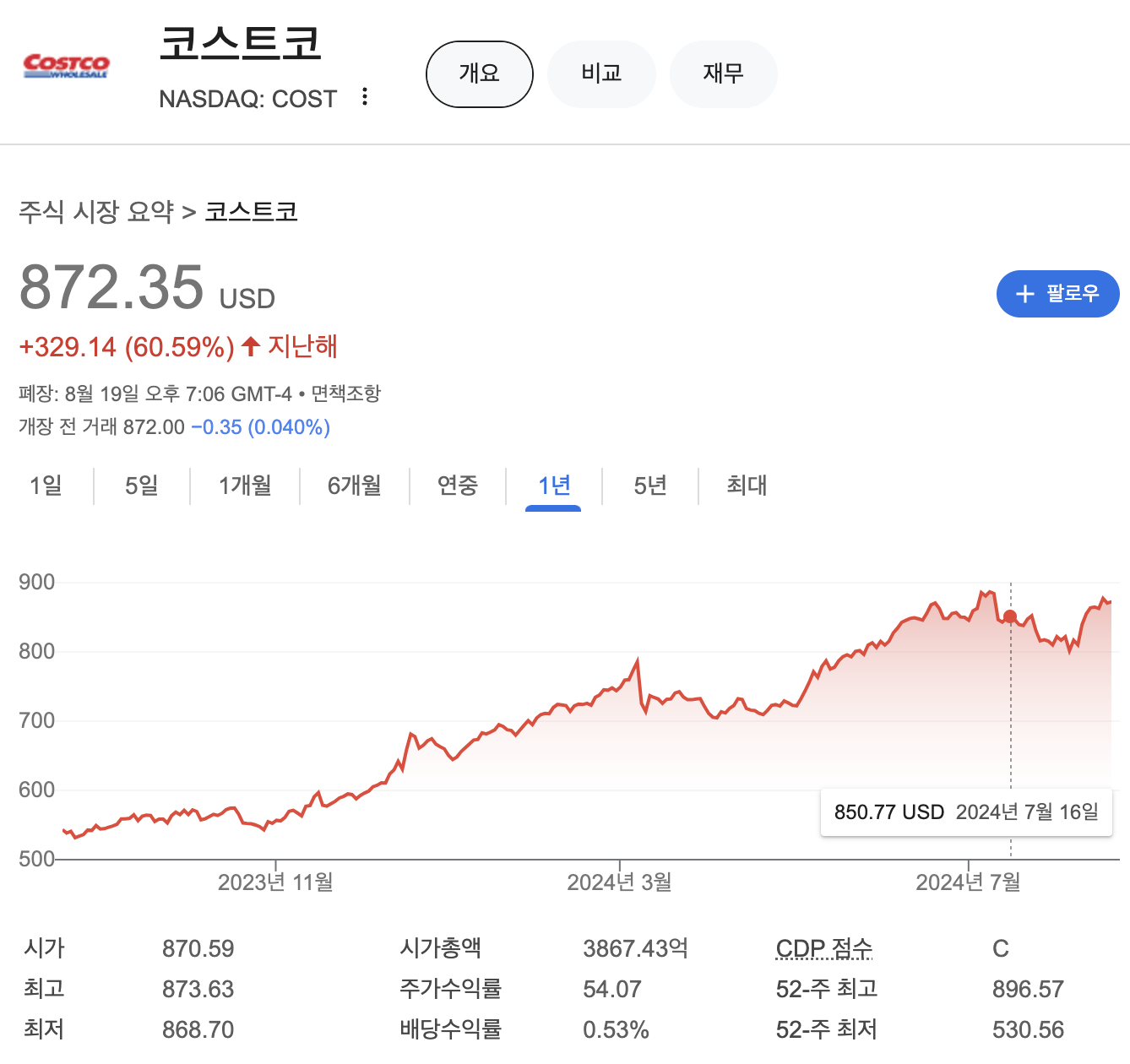 코스트코의 주가는 지난해 1년대비 60.59% 상승해 있는 상태 입니다.