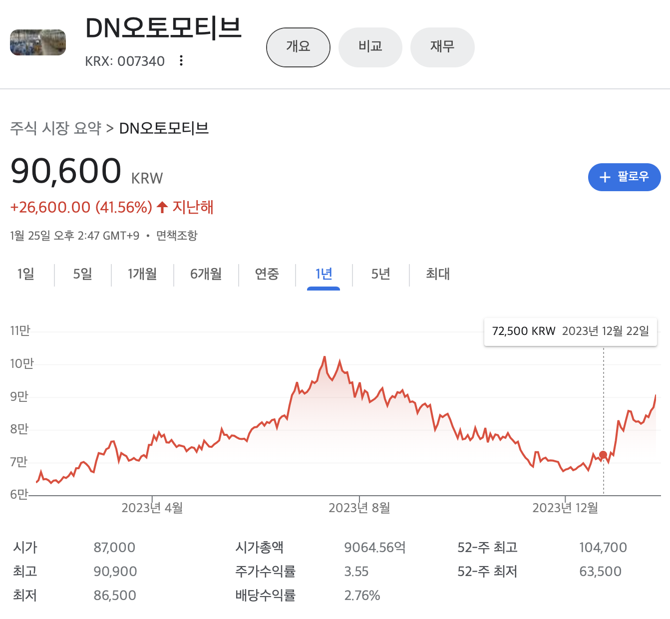 DN오토모티브 주가(2024년 1월기준)