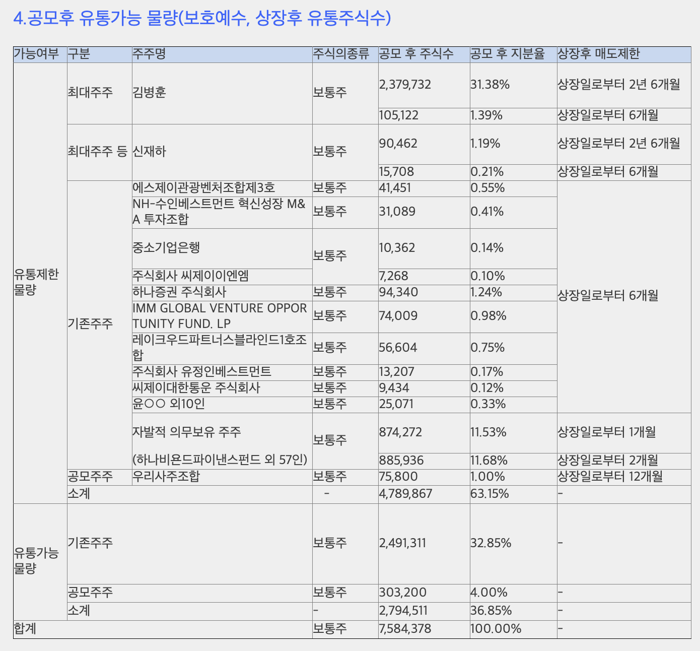 - 공모후 유통가능 물량 자세한 정보는 하단 이미지 표를 참고하시기 바랍니다.