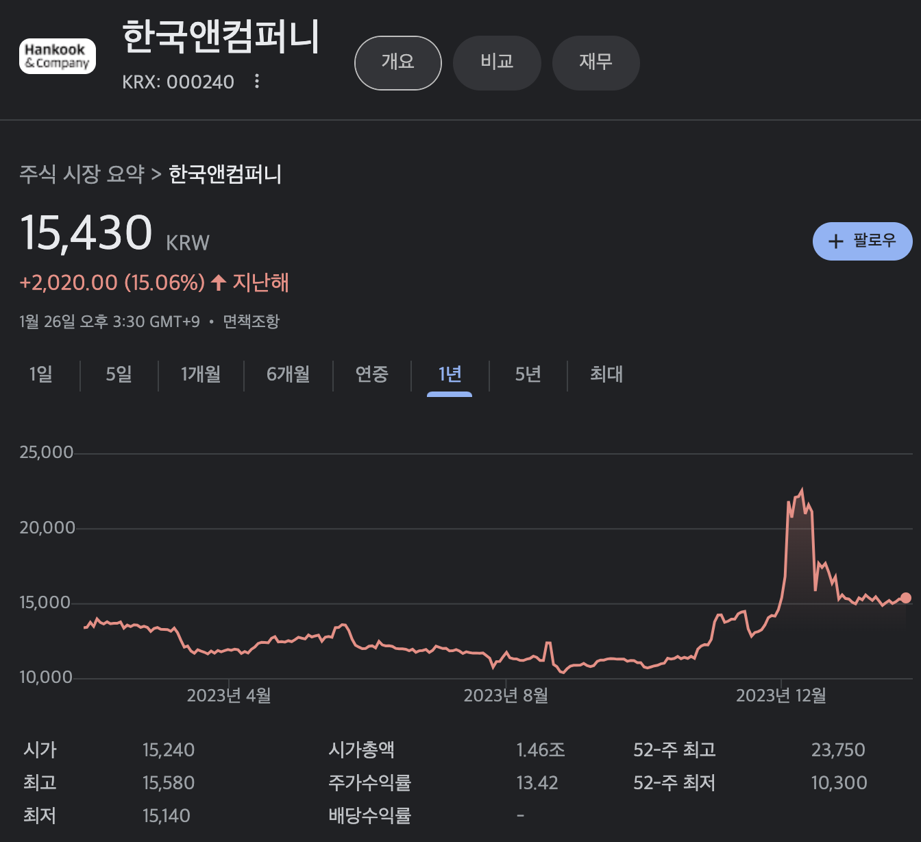 최근 한국앤컴퍼니(000240)의 실시간 시세, 이전 실적, 차트를 비롯한 금융 정보를 확인하여 충분한 정보를 바탕으로 주식 거래와 투자를 결정하세요.