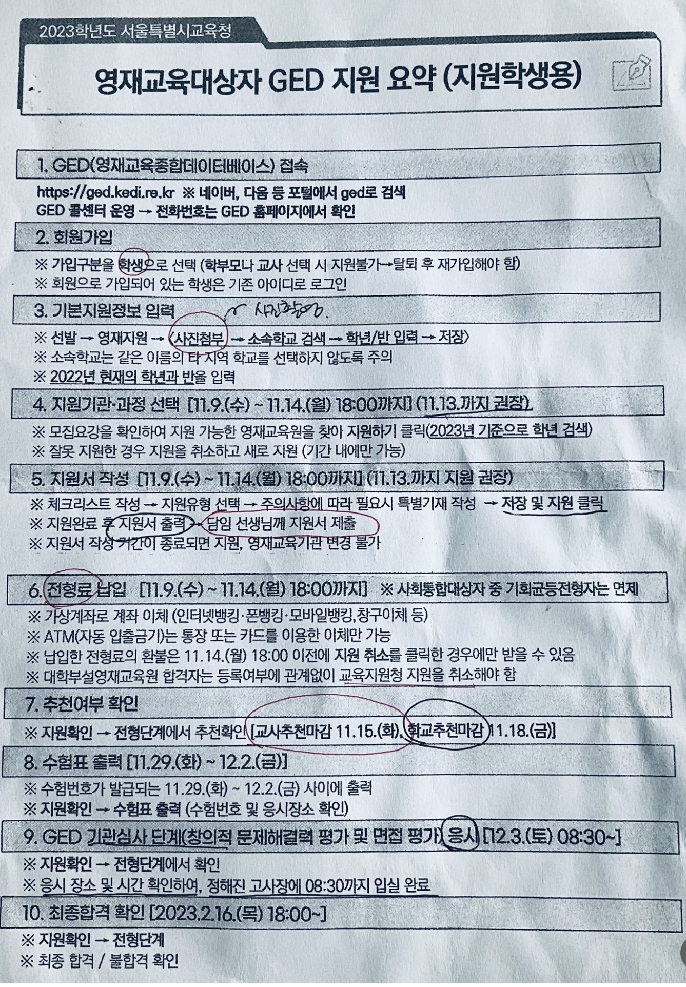11월까지 GED사이트에서 교육청 영재원 지원 서류 작성(사진필요) 합니다.