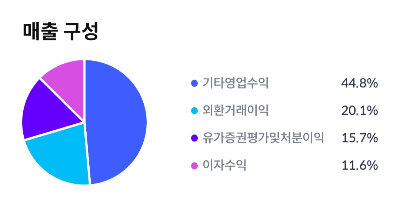신영증권은 기타영업수익 44.8%, 외환거래이익 20.1%, 유가증권평가 및 처분이익 15.7%, 이자수익 11.6%의 매출 구성을 하고 있습니다.