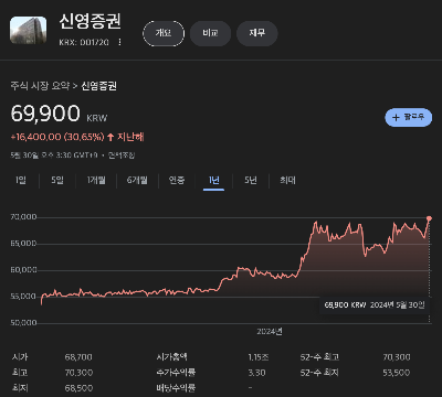 신영증권의 주가는 지난해 1년대비 30.65% 상승해 있습니다.