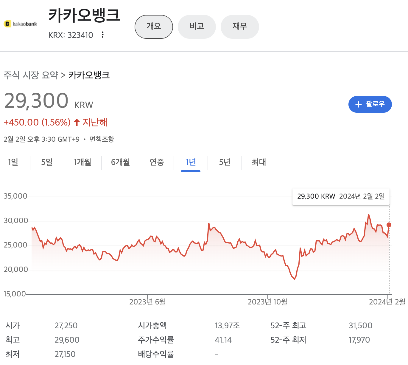 카카오뱅크의 주가는 지난해 1년대비 1.56% 상승해 있는 상태 입니다.