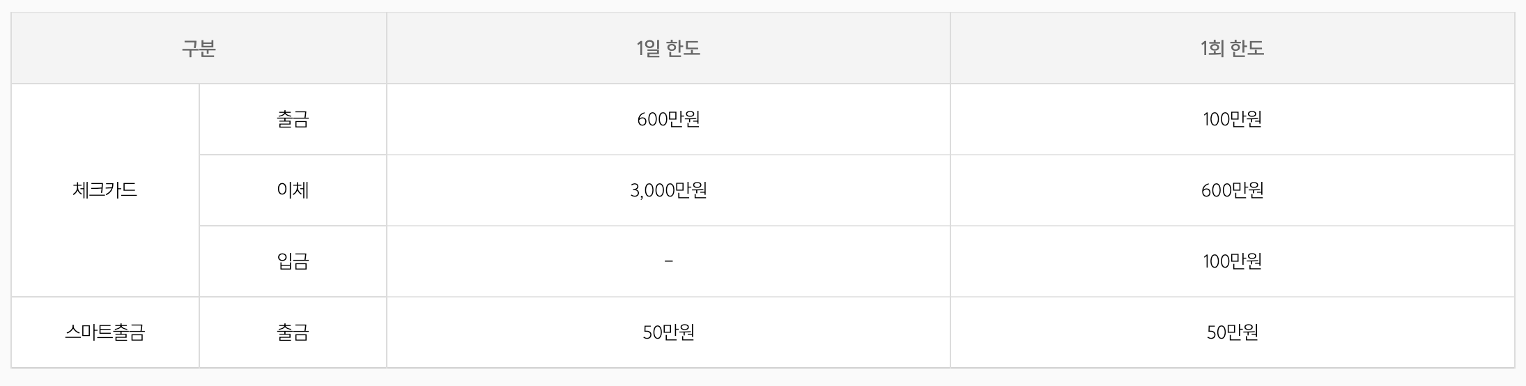 - 은행 출금 이용서비스 및 한도는 아래의 표를 참고 하시면 됩니다.