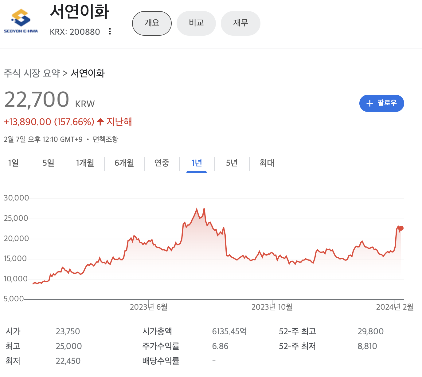 서연이화 주가(2024년 2월기준)