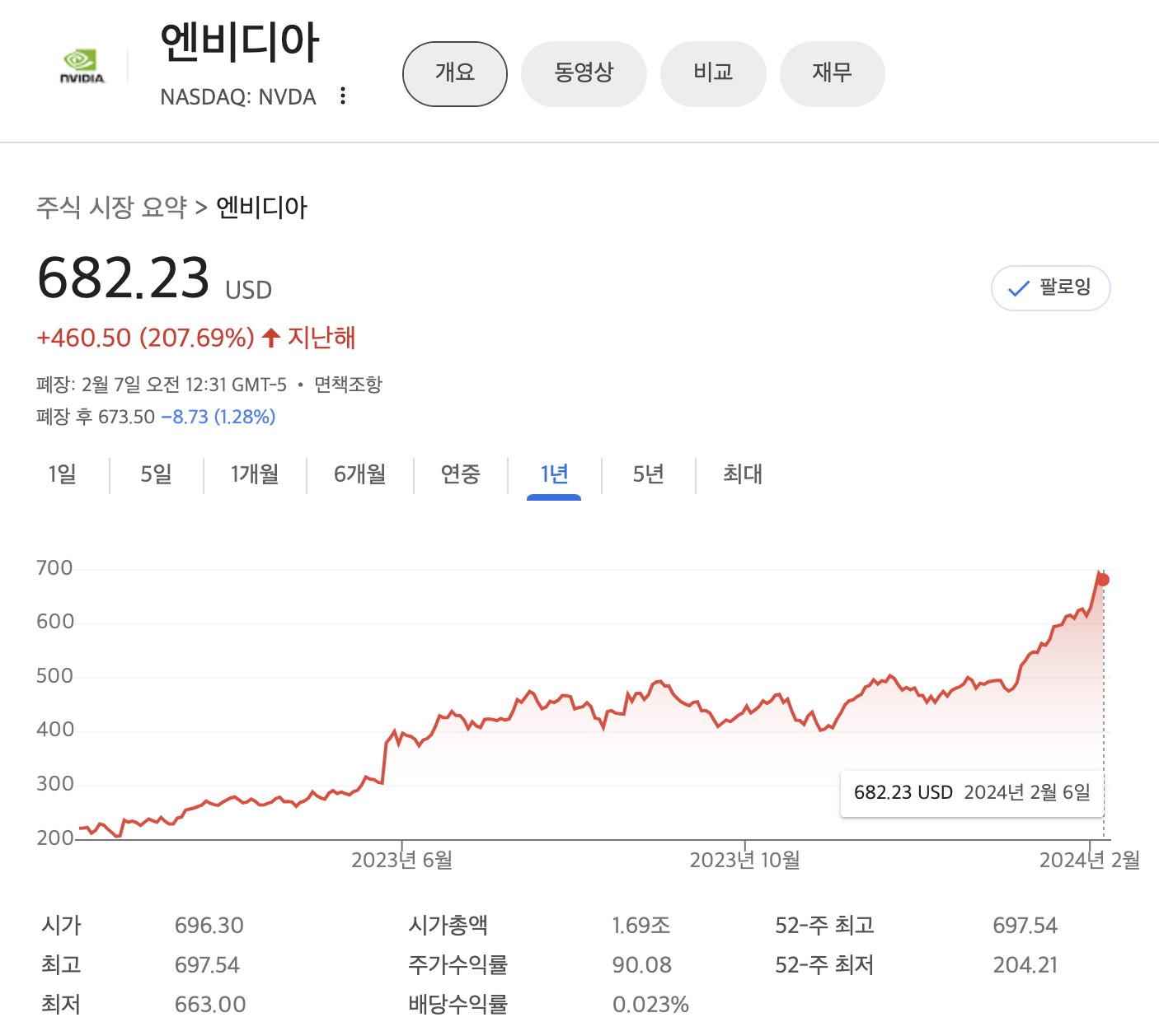 엔비디아의 지난해 1년대비 주가는 207.69% 상승해 있는 상태 입니다.