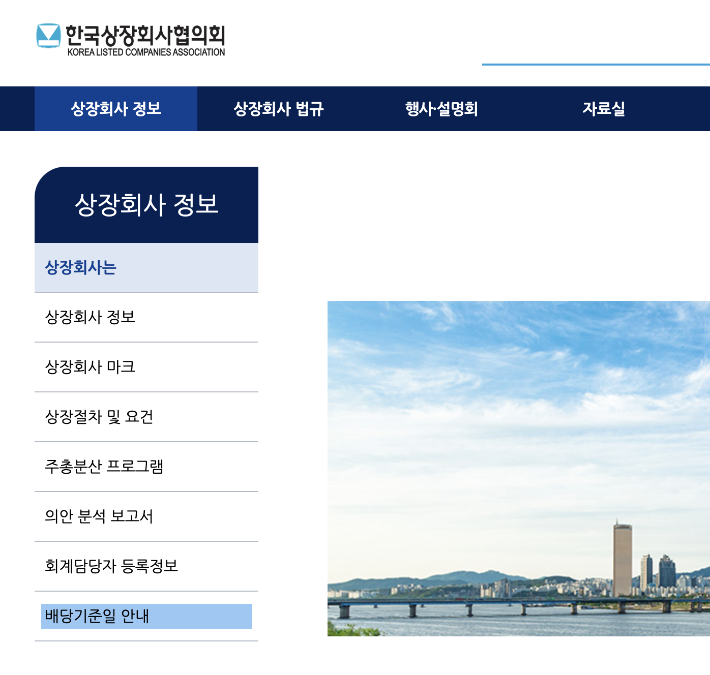 한국상장사협회 사이트 입니다.(각 기업의 배당기준일 확인가능)