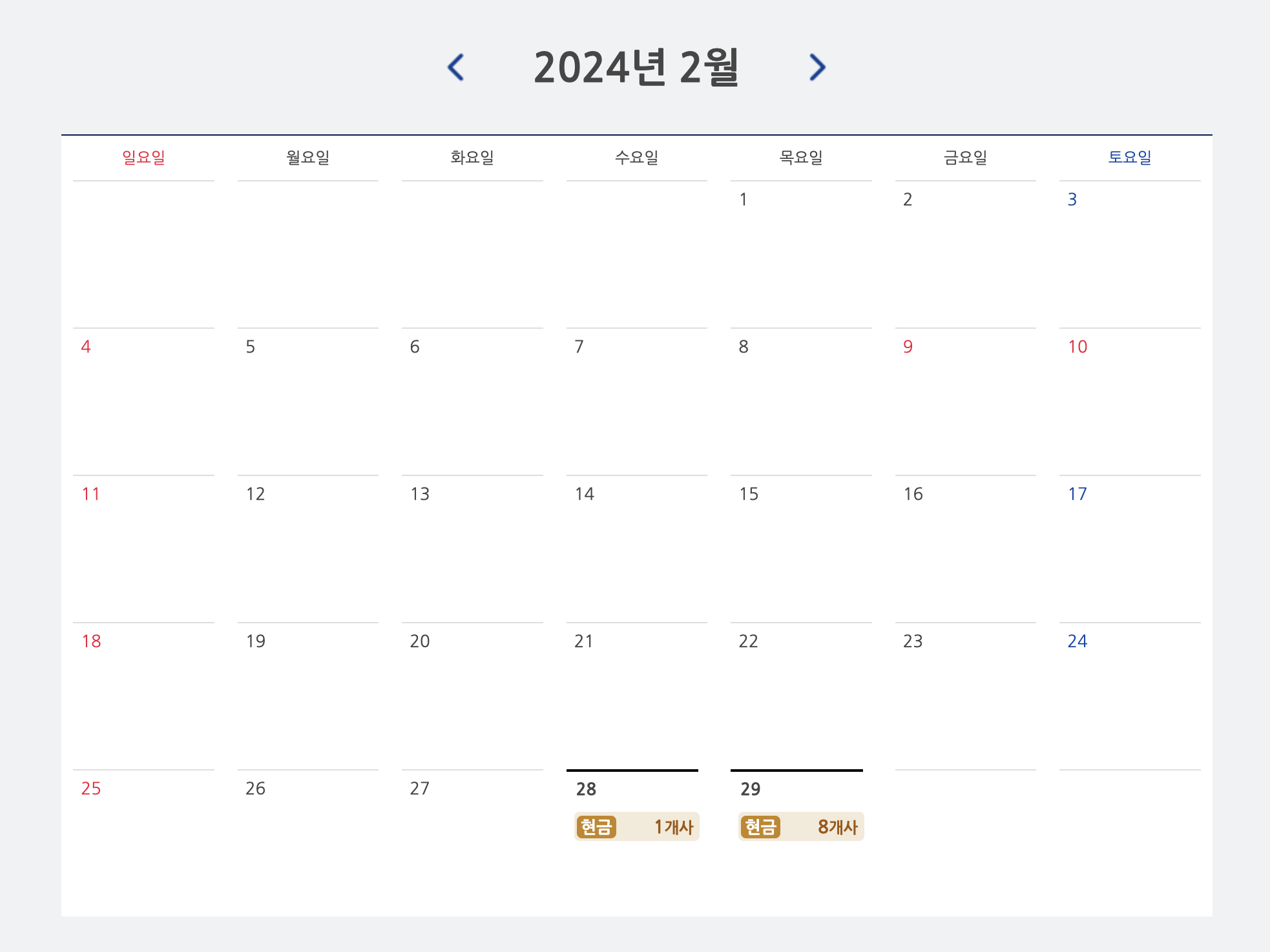 4. 배당기준일 안내 클릭시 > 오른쪽 메인화면에 "배당기준일 안내"와 "해당월의 달력"이 표시 됩니다.