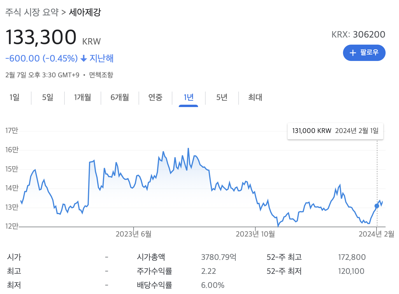 세아제강 주가(2024년 2월기준)