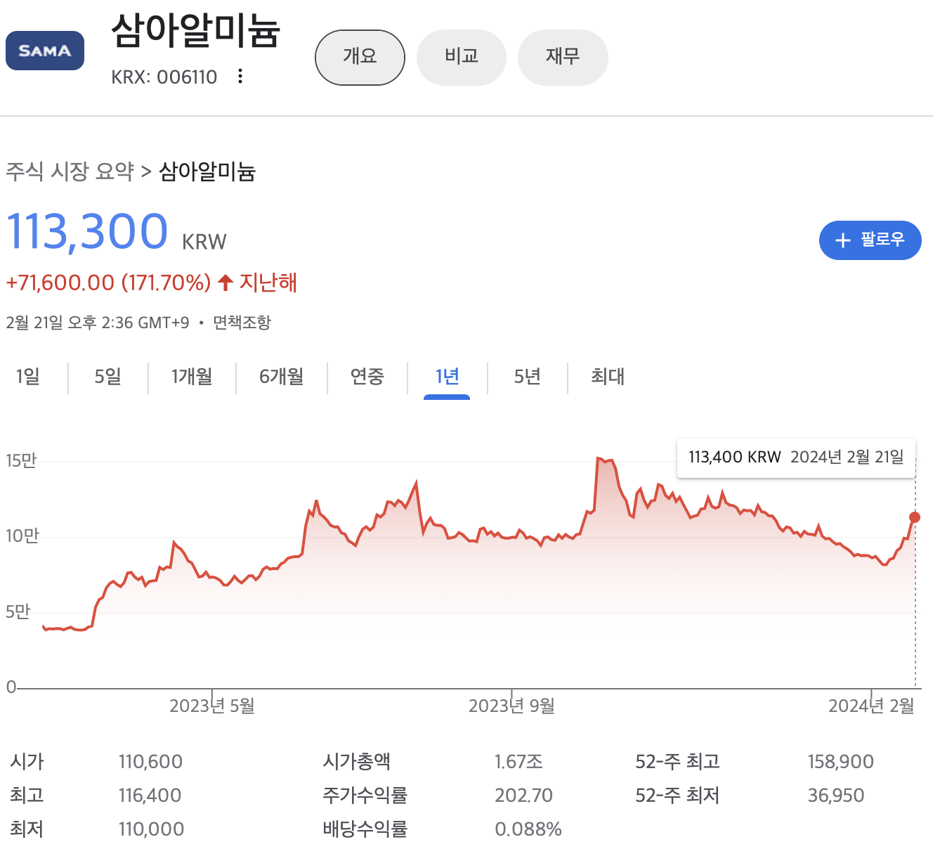 삼아알미늄 주가(2024년 2월기준)
