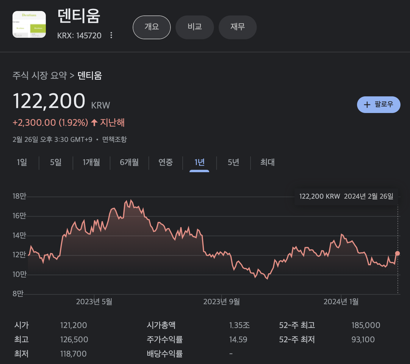 52주 최고 185,000원이었으며 52주 최저 93,100원이었습니다.