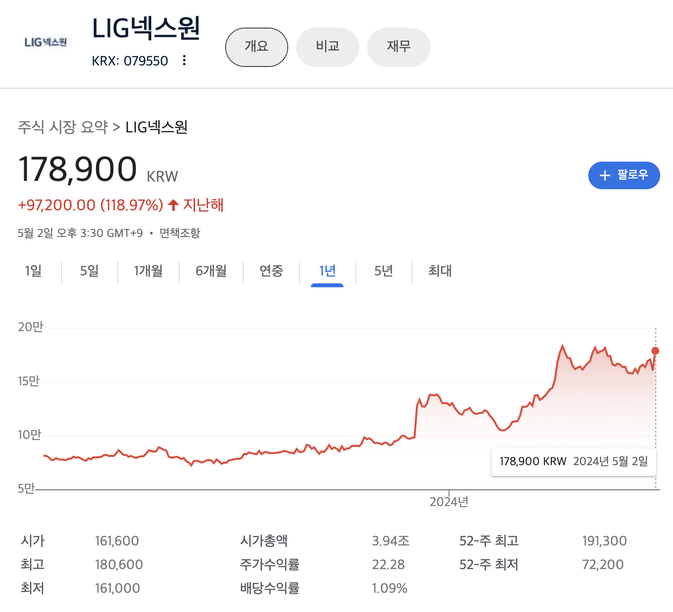 LIG넥스원 주가는 지난해 1년대비 118.97% 상승해 있는 상태 입니다.