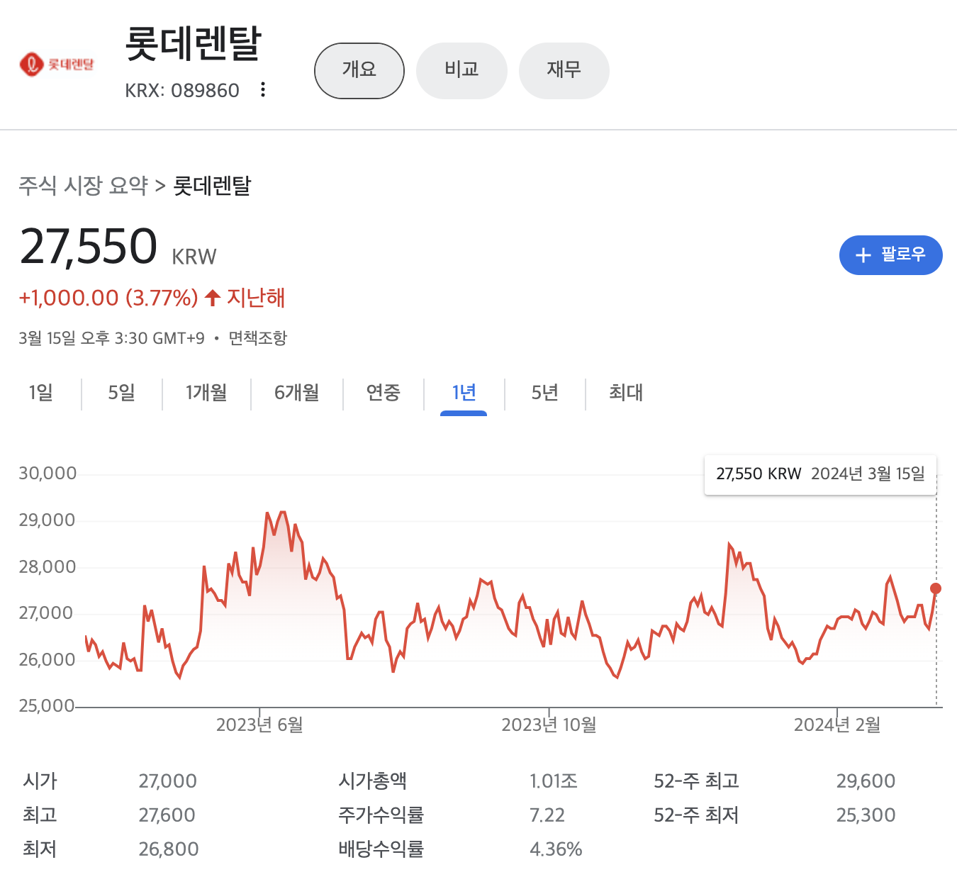 롯데렌탈 주가는 지난해 1년대비 3.77% 상승해 있는 상태 입니다.